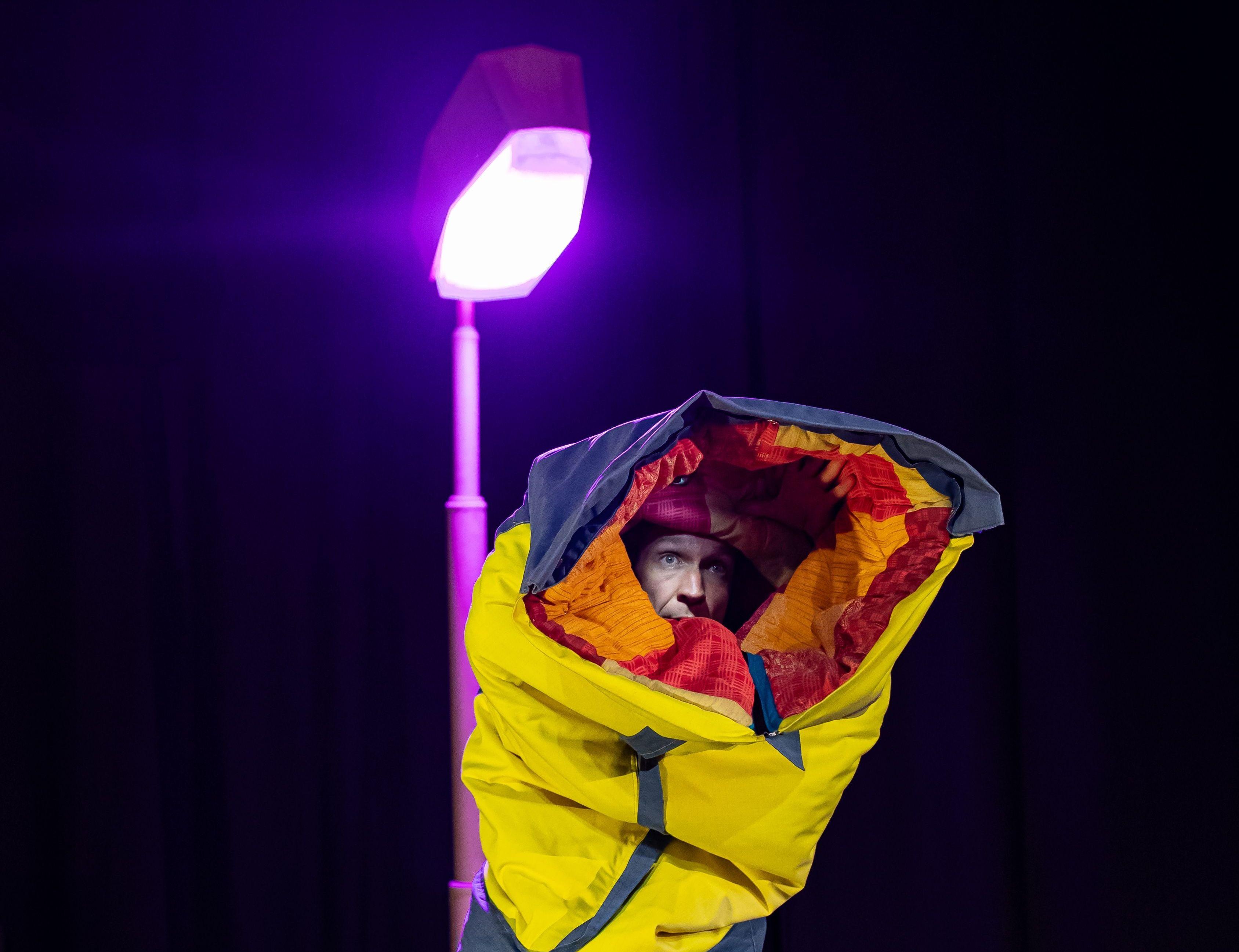 Jaszak is a poetic and musical performance for young audiences, centred on a homeless man in a changing world — or is it he who is changing? Inspired by the design of Sheltersuit, Simone de Jong creates a musical journey that builds on her earlier production Kluizelaar. The performance is suitable for children aged 2–6, as well as for anyone wishing to feel small again for a moment.Theaterkrant on the production:“Man with coat-house elicits priceless reactions from young audiences.” – L.N.P.Direction & concept: Simone de JongPerformance: Toon KuijpersLive music: Niels VermeulenCostume: SheltersuitLighting design: James MurrayDramaturgical advice: Céline Buren / Dirk GroeneveldDesign: Erik Begemann & Elian SmitsPhotography: Kamerich & BudwilowitzGraphic design: Sanne van RooijHair design: Leo Maliepaard