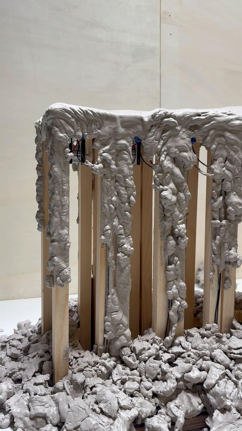 Thixocymatics is a kinetic sculpture by Aldo Brinkhoff that explores the interaction between vibration, matter, and transformation. The work is based on the behaviour of thixotropic materials — substances whose viscosity changes over time under applied force, allowing them to alternate between solid and liquid states — and draws from the principles of cymatics, the study of how vibrations generate patterns. In contrast to traditional cymatic experiments, which take place within a flat liquid plane, Thixocymatics expands this process into a three-dimensional space. The work was developed in collaboration with Associate Professor Eduardo Mendez of TU Delft, whose research focuses on Functional Soft Matter. Using tools from the world of construction, particularly concrete formwork, the artist manipulates a block of thixotropic calcium. The material resists stability, continuously reshaping itself into an evolving, unstable landscape. Through this perpetual flux, Thixocymatics embodies a delicate balance between order and collapse, control and emergence, structure and fluid transformation.