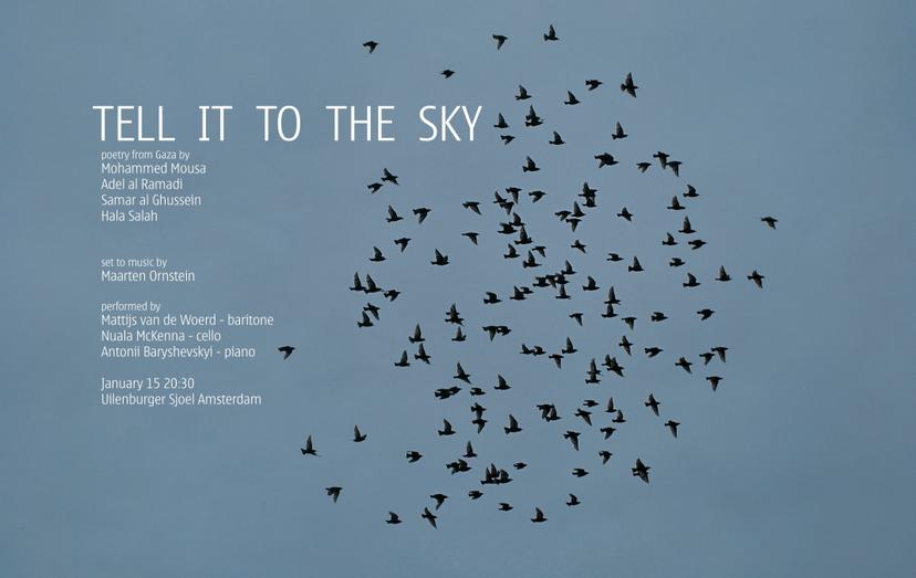 Tell it to the Sky is a new composition cycle of six songs by Maarten Ornstein for baritone, piano, and cello, set to texts by poets currently living — or struggling to live — in Gaza: Mohammed Mousa, Adel al Ramadi, Samar al Ghussein, and Hala Salah. Their poignant poetry expresses both hope and despair — the hope to survive, to reunite with a loved one, to see rain and flowers; and the despair over lost friends and family amidst destruction, hunger, and chaos.