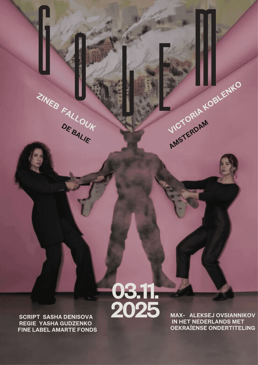 Gebaseerd op waargebeurde verhalen schreef de Oekraïense auteur en regisseur Sasha Denisova de aangrijpende theatertekst Golem, waarin zij een stem geeft aan twee vrouwen die zijn achtergebleven, de stille slachtoffers van oorlog over wie zelden wordt geschreven. In De Balie in Amsterdam brengen actrices Zineb Fallouk en Victoria Koblenko een try-out van het stuk, onder regie van Yasha Gudzenko (United Ukrainian Theatre). Aansluitend gaan Sasha, Yasha en Victoria in gesprek over het vinden van woorden voor het zichtbare en onzichtbare geweld van een oorlog die nog altijd voortduurt.